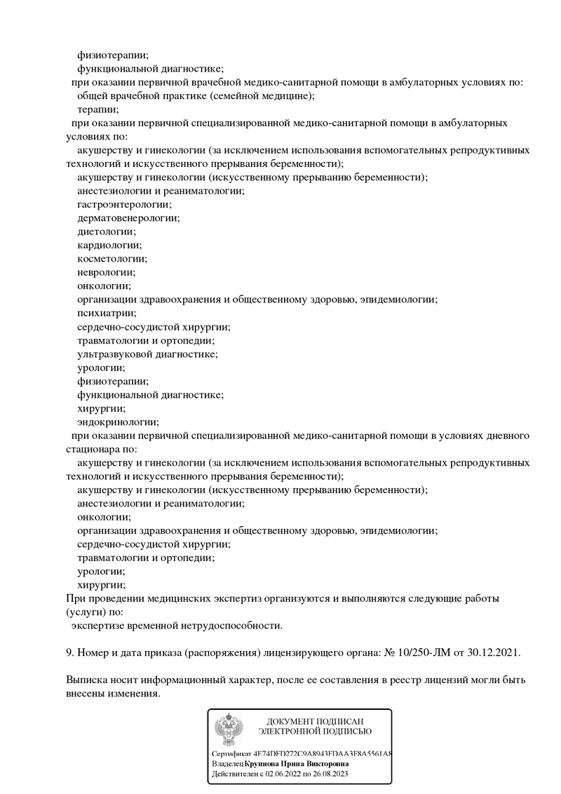 Проводит диагностику и лечение заболеваний женской половой сферы, в том числе онкологической патологии. Владеет всеми манипуляциями в рамках амбулаторного приема врача-гинеколога.